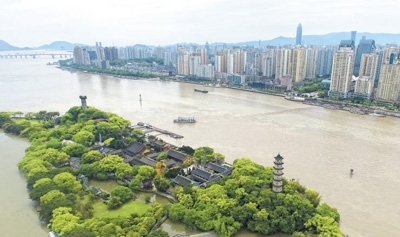 朔門古港與江心嶼航標(biāo)塔俯拍。