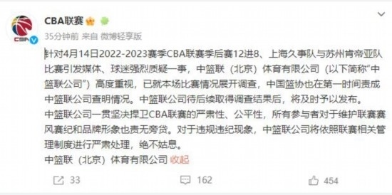 CBA聯(lián)賽官方微博15日凌晨發(fā)布消息表示:針對4月14日2022-2023賽季CBA聯(lián)賽季后賽12進8、上海久事隊與蘇州肯帝亞隊比賽引發(fā)媒體、球迷強烈質疑一事,中籃聯(lián)(北京)體育有限公司(以下簡稱“中籃聯(lián)公司”)高度重視,已就本場比賽情況展開調查,中國籃協(xié)也在第一時間責成中籃聯(lián)公司查明情況。中籃聯(lián)公司待后續(xù)取得調查結果后,將及時予以發(fā)布。