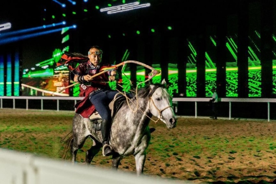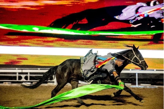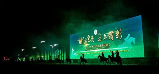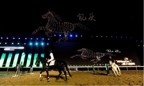 開幕式文體表演由《馬術(shù)方陣一馬當先》、歌伴舞《我的城我的馬》、《名馬展示策馬揚鞭》、《單馬技巧雙翼神馬》、《馬障礙秀躍馬揚鞭》、《馬術(shù)秀人馬合一》、歌伴舞《騎跡包頭》、《無人機秀馬上精彩》八塊內(nèi)容組成。當晚的賽汗塔拉馬術(shù)賽場流光溢彩、氣氛熱烈,場內(nèi)座無虛席、歡聲雷動。20時30分許,主騎手手持國旗,副騎手手持馬城旗幟,運動員方陣、民族方陣、女騎方陣、馬主方陣入場,騎手們精神飽滿、英姿颯爽,不時揮手致意,現(xiàn)場觀眾用熱烈的掌聲和歡呼聲,歡迎他們的到來。達茂旗9歲賽馬冠軍阿茹樂手持彩旗引出世界名馬亮相,40對人馬合一的“千古馬頌”表演震撼全場,1000架無人機躍然天空,點亮“騎跡包頭 馬上精彩”的字樣……藍天、碧水、凈土的包頭在策馬奔騰的馬術(shù)競技中拉開了“中國馬城”的壯麗畫卷。