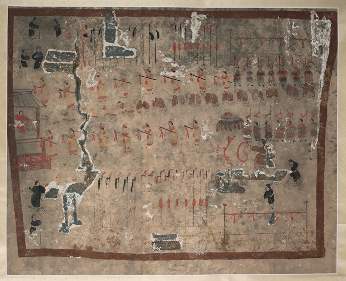 再繞回前室中層,橫跨東北西3面墓壁即是《護(hù)烏桓校尉出行圖》。墓主人所乘軺車,駕3匹黑馬,榜題“使持節(jié)護(hù)烏桓校尉”等字,主車前后有鼓車、斧車,層層環(huán)護(hù)眾多武官、兵丁,隨從有“別駕從事”“功曹從事”“校尉行部”等下屬官職,連車列騎,旗旌飄揚(yáng),場面極為壯觀。中室東壁下半部描繪的是《寧城圖》與《護(hù)烏桓校尉幕府圖》?!秾幊菆D》畫有城垣、城門、衙署等內(nèi)容,其中寧城南門外武士持戟列隊(duì)、身著胡服的少數(shù)民族人物徐徐入內(nèi)的場景最為突出。占據(jù)主畫面的是《護(hù)烏桓校尉幕府圖》,由于任護(hù)烏桓校尉官職是墓主人一生中最值得炫耀的經(jīng)歷,所以,此圖描繪得最為詳細(xì)夸張,是整個壁畫中的核心部分。整個幕府分為堂院、營舍和庖舍3個部分,堂屋為高大的廡殿式房屋,墓主人端坐堂上,堂下藝人在表演樂舞雜耍,少數(shù)民族人物伏拜覲見,周圍環(huán)立官吏武士,場面喧囂隆重。營舍位于幕府后院,是幕府中管理軍務(wù)的機(jī)構(gòu)所在,庖舍位于幕府的西南角,掌管幕府廚飲之事。