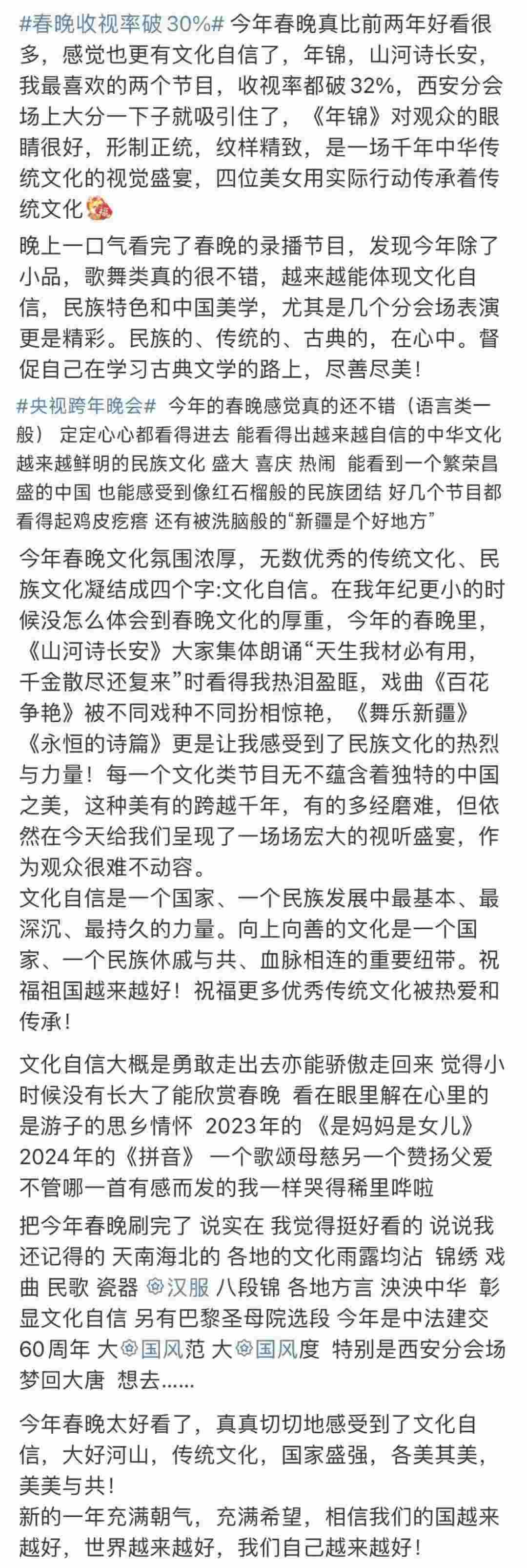 春晚的文化展現(xiàn),在國人中也引起了熱烈反響。“每一個(gè)文化類節(jié)目都蘊(yùn)含著獨(dú)特的中國之美,這種美有的跨越千年,有的多經(jīng)磨難,春晚給我們呈現(xiàn)了一場場宏大的視聽盛宴,作為觀眾很難不動(dòng)容”“從今年春晚真真切切地感受到了文化自信,大好河山,傳統(tǒng)文化,國家強(qiáng)盛,美美與共”“文化傳統(tǒng)特色給各個(gè)節(jié)目都刷了創(chuàng)意的漆,霸氣從節(jié)目中升騰,自信從感嘆中生發(fā),真妙”......