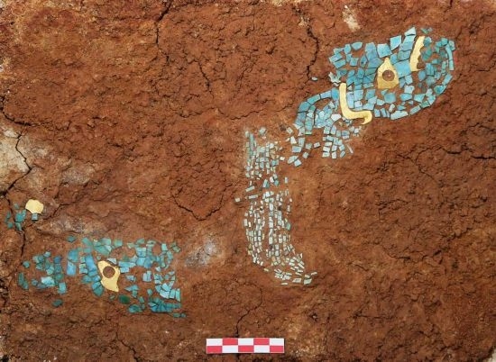 湖北黃陂盤龍城遺址楊家灣M17出土的金片綠松石鑲嵌飾。(全國(guó)十大考古新發(fā)現(xiàn)活動(dòng)辦公室供圖)