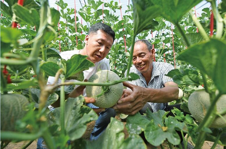 2020年7月,呼和浩特市賽罕區(qū)黃合少鎮(zhèn)賽音不浪村建立網(wǎng)紋瓜種植基地,科技特 派員 李國(guó) 慶(左)向種植戶提供技術(shù)、種子,采取訂單銷售,帶領(lǐng)村民致富。