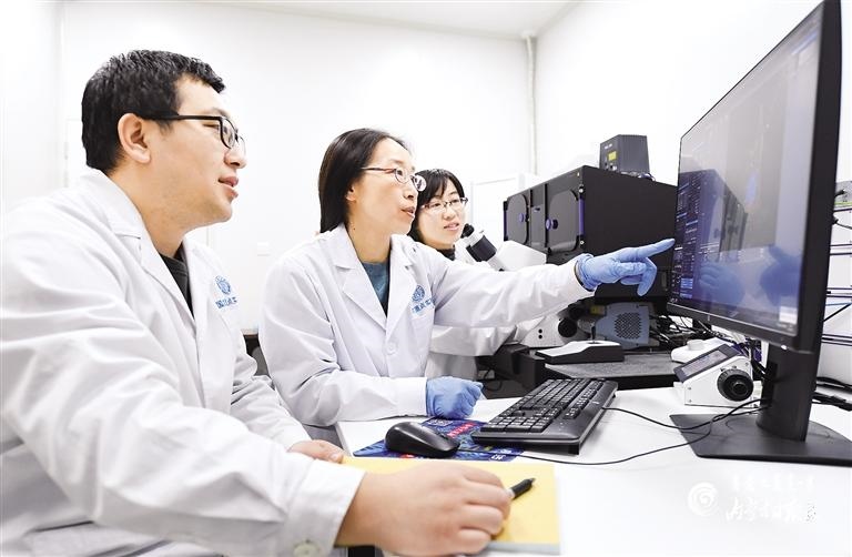 內(nèi)蒙古大學(xué)生命科學(xué)學(xué)院院長、省部共建草原家畜生殖調(diào)控與繁育國家重點實驗室主任胡薇(中)與團(tuán)隊成員觀察動物的成纖維細(xì)胞結(jié)構(gòu)形態(tài)。內(nèi)蒙古日報社融媒體記者 王磊 攝