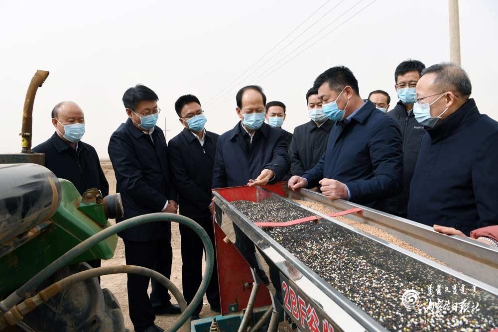 驚蟄已過,春耕在即。石泰峰一下飛機就驅(qū)車來到臨河農(nóng)場八分場,直奔田間地頭,考察春耕備耕情況。在小麥播種現(xiàn)場,他與種植戶和當?shù)馗刹抗苍掁r(nóng)桑,詳細了解土壤墑情、測土施肥、種植結(jié)構(gòu)、糧播面積、春耕資金保障等情況,并與大家一筆筆測算成本、估算收入。石泰峰說,當前正值農(nóng)業(yè)生產(chǎn)的關(guān)鍵時期,各地要不違農(nóng)時地謀劃好組織好各項工作,加強農(nóng)機、農(nóng)資、種子供應(yīng)儲備,研究搞好市場供需調(diào)度和產(chǎn)銷對接,為今年糧食豐收和農(nóng)民增收打好基礎(chǔ)。他指出,耕地是最寶貴的資源,我們既要用好耕地,也要采取有效措施護地養(yǎng)地,推動農(nóng)業(yè)可持續(xù)發(fā)展?! ?/p>