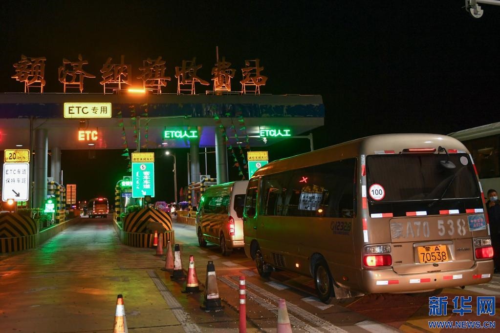 10月29日,滯留在額濟(jì)納旗的旅游包車有序通過(guò)額濟(jì)納旗收費(fèi)站。新華社記者 貝赫 攝