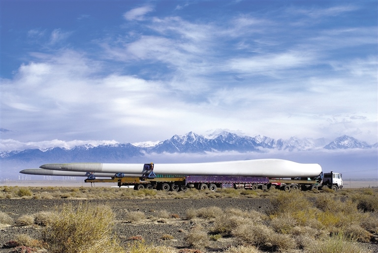 運送風(fēng)電葉片的車輛行駛在阿拉善戈壁。馬建荃 攝