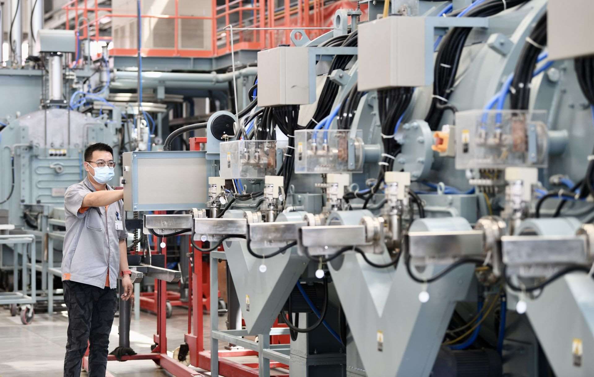 在包頭市稀土高新區(qū)大地熊(包頭)永磁科技有限公司生產(chǎn)車間內(nèi),技術(shù)人員查看設(shè)備運行情況。