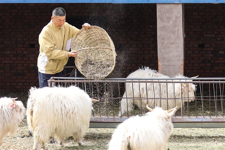 杜伍則為絨山羊添草料。記者馬駿馳攝