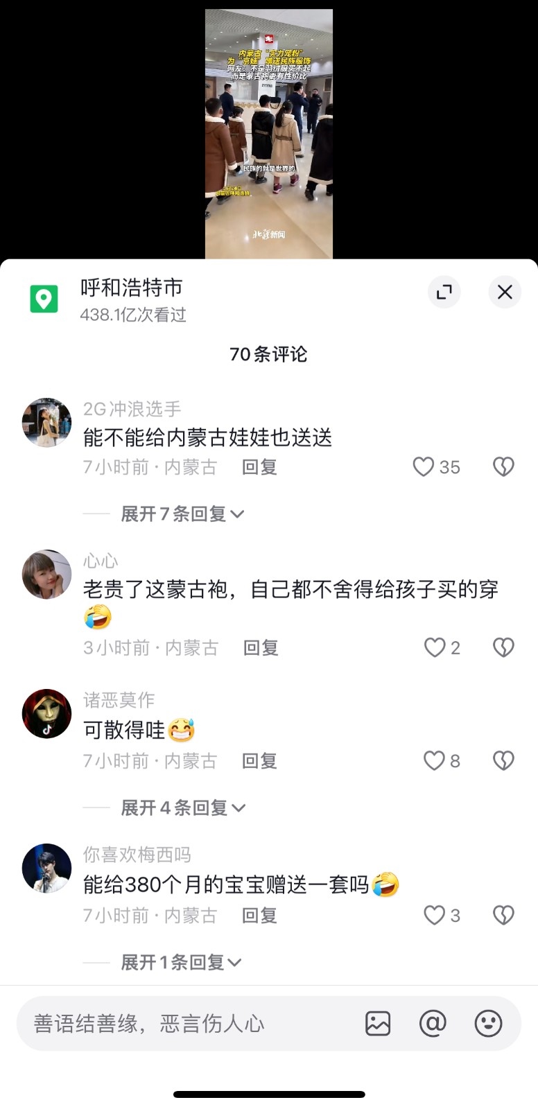 內(nèi)蒙古為了招待北京來的萌娃們,直接送了溫暖的蒙古袍,對(duì)于這些,本地人的反應(yīng)是:“能不能給內(nèi)蒙古娃娃也送送”“能給380個(gè)月的寶寶贈(zèng)送一套嗎”。還有本地人表示,“蒙古袍子就送了”“老貴了這蒙古袍,自己都不舍得給孩子買的穿”。