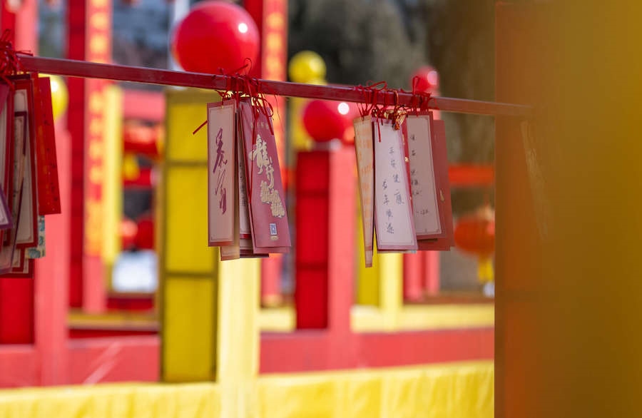 在九曲中,有九道門,其中八道門可以猜燈謎,猜對后換一張祈??▉淼郊殚T進行許愿祈福。