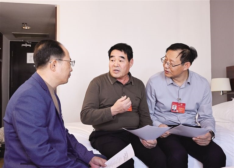 3月4日,住我區(qū)全國政協(xié)委員阿拉騰達來(左)、廷·巴特爾(中)、曹金山(右)在住地,就進一步提高草原生態(tài)保護補助獎勵標準,為打贏“三北”工程攻堅戰(zhàn)和三大標志性戰(zhàn)役奠定政策基礎(chǔ)的提案進行討論。草原全媒·內(nèi)蒙古新聞網(wǎng)記者 韓卿立 攝