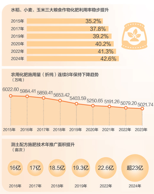 2024年,我國水稻、小麥、玉米三大糧食作物化肥利用率為42.6%,比2022年提高1.3個百分點?;世寐剩椿时蛔魑镂绽玫谋壤?,反映了化肥在農(nóng)業(yè)生產(chǎn)中的有效利用程度。科學(xué)施肥效果提升,折射農(nóng)業(yè)發(fā)展方式之變。