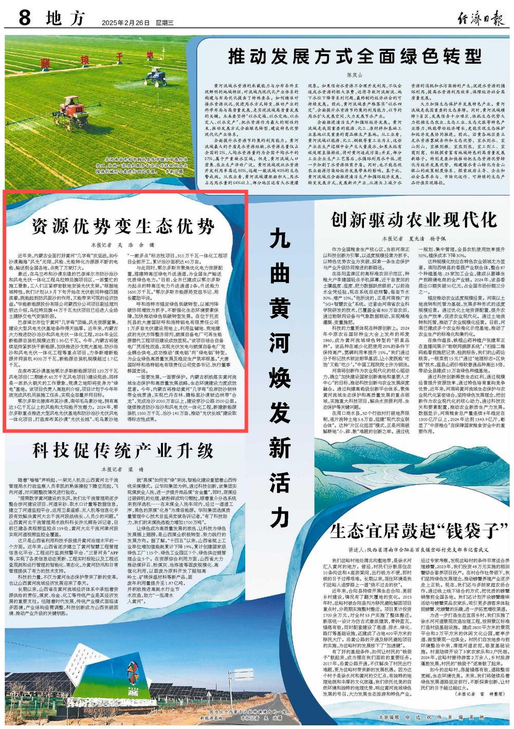 2025年2月26日,《經濟日報》第8版刊發(fā)題為《資源優(yōu)勢變生態(tài)優(yōu)勢》的文章,報道了近年來,內蒙古全面打好黃河“幾字彎”攻堅戰(zhàn),如今沙漠瀚?!帮L光”無限,風能、光能轉化為源源不斷的電能,輸送到全國各地,點亮了萬家燈火。