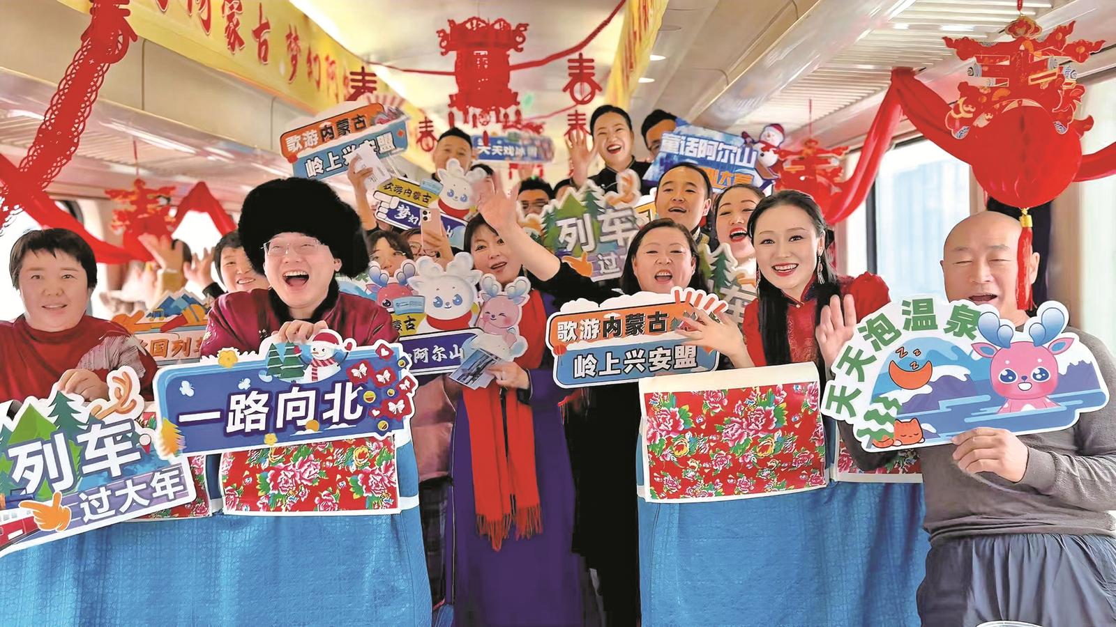 一張張貼在車窗上的“非遺”窗花剪紙,一條條紅黃藍(lán)大花座椅枕巾,一節(jié)節(jié)以藍(lán)天白云為底色的車廂頂棚,一首首悅耳的草原歌曲和悠揚(yáng)的馬頭琴聲……這個(gè)冬季,一列列由內(nèi)蒙古興安盟烏蘭浩特往返于阿爾山百年老車站的“歌游內(nèi)蒙古 夢幻阿爾山”冰雪主題列車成為人們爭相體驗(yàn)的旅游產(chǎn)品。