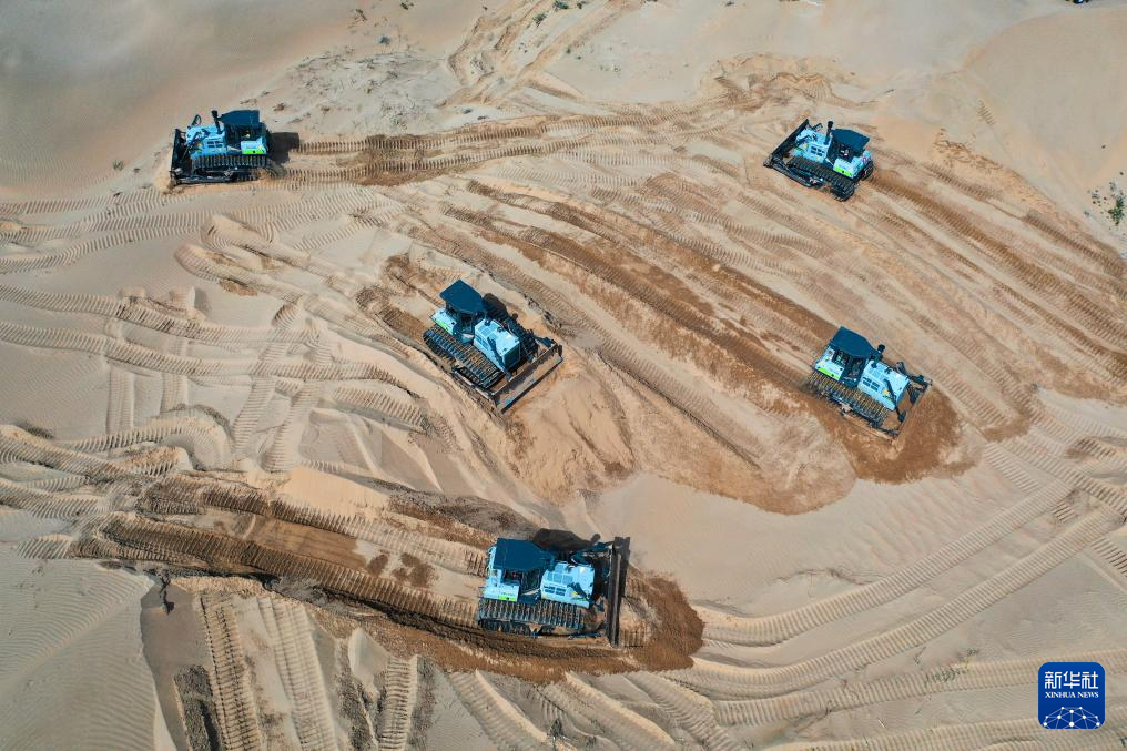6月7日,在鄂爾多斯市達(dá)拉特旗境內(nèi)的庫(kù)布其沙漠,工程機(jī)械在平整沙地、開展光伏治沙工程建設(shè)(無(wú)人機(jī)照片)新華社記者 李志鵬 攝