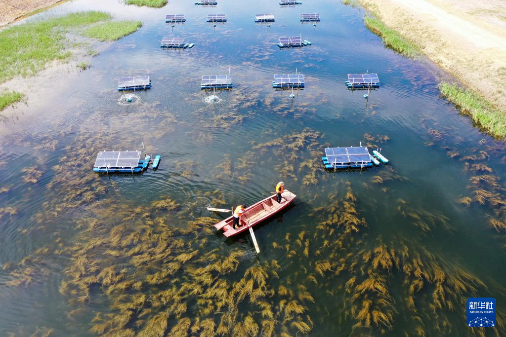 6月4日,在烏拉特前旗九排干人工濕地,工作人員在巡檢太陽(yáng)能曝氣機(jī)。該設(shè)備可對(duì)進(jìn)入烏梁素海的水體曝氣增氧(無(wú)人機(jī)照片)新華社記者 李志鵬 攝