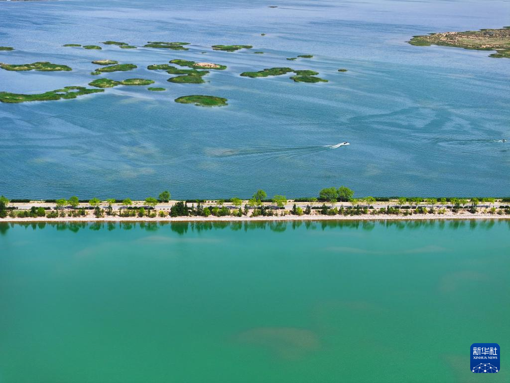 6月5日,在巴彥淖爾市磴口縣奈倫湖國(guó)家濕地公園,摩托艇行駛在湖面上(無(wú)人機(jī)照片)新華社記者 李志鵬 攝