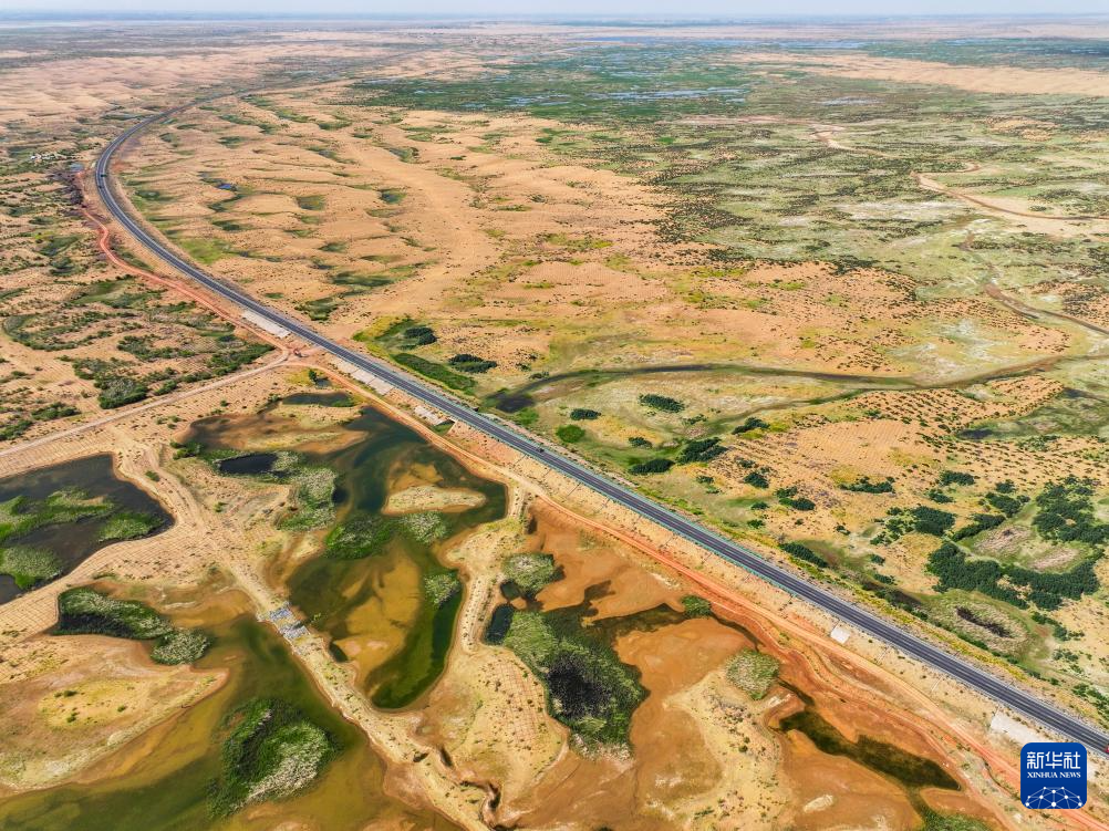 在巴彥淖爾市磴口縣,公路穿越烏蘭布和沙漠(6月5日攝,無(wú)人機(jī)照片)新華社記者 連振 攝