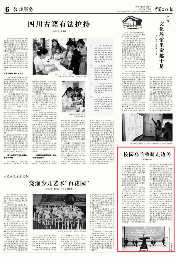 2025年6月11日,《中國(guó)文化報(bào)》第6版刊發(fā)題為《校園烏蘭牧騎走邊關(guān)》的文章,報(bào)道了內(nèi)蒙古藝術(shù)學(xué)院烏蘭牧騎藝術(shù)團(tuán)師生來(lái)到烏拉特中旗邊防一線,開(kāi)展慰問(wèn)演出,歌曲、舞蹈、器樂(lè)演奏輪番登場(chǎng),贏得陣陣掌聲。