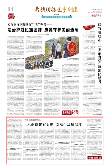 2025年9月23日,《中國(guó)民族報(bào)》第4版刊發(fā)題為《內(nèi)蒙古巴彥淖爾市:示范創(chuàng)建有力度 幸福生活加溫度》的文章,報(bào)道了2023年6月,習(xí)近平總書記在內(nèi)蒙古自治區(qū)考察調(diào)研時(shí),首次提出“鑄牢中華民族共同體意識(shí)是新時(shí)代黨的民族工作的主線,也是民族地區(qū)各項(xiàng)工作的主線”。巴彥淖爾市始終牢記囑托,將“鑄牢”貫穿于想問題、作決策、干工作的全過程。