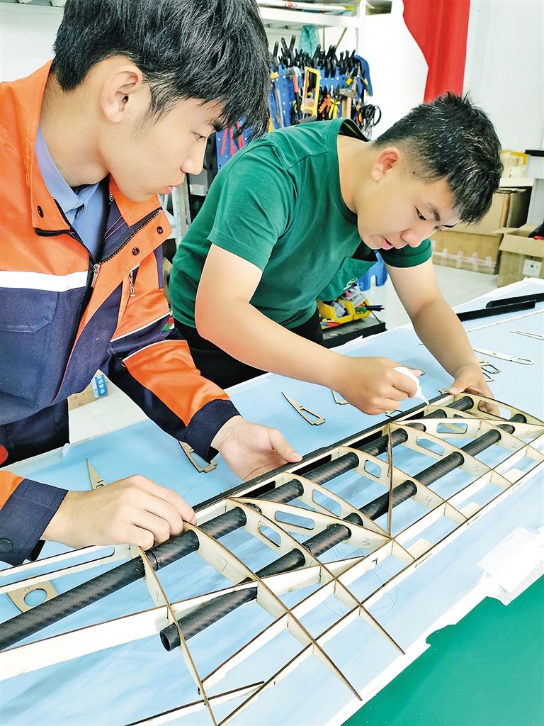 內(nèi)蒙古工業(yè)大學(xué)智能裝備研究院工作人員正在進(jìn)行TS300長航時大載重固定翼無人運(yùn)輸機(jī)室內(nèi)組裝工作。