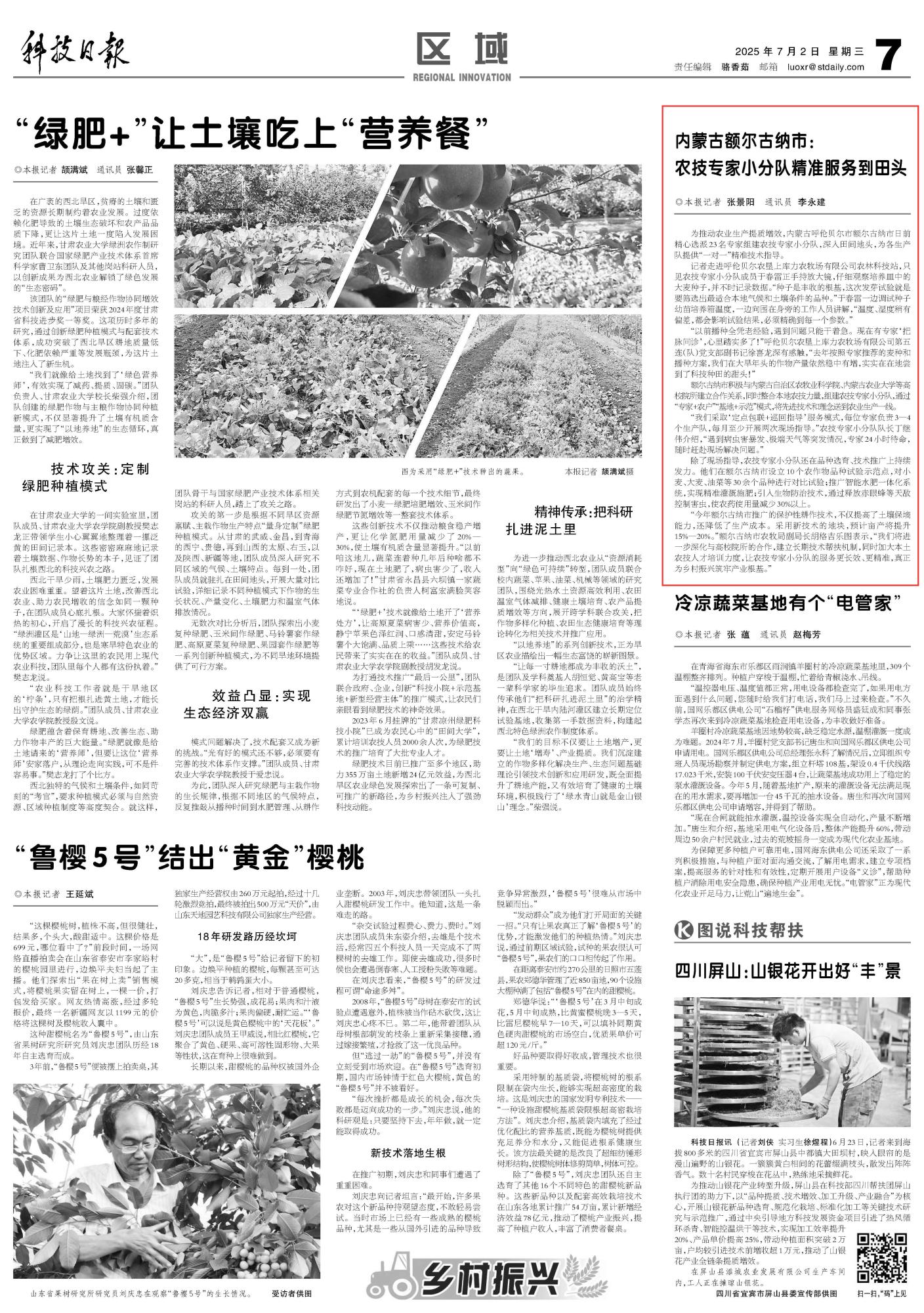 2025年7月2日《科技日報》第7版刊發(fā)了《內(nèi)蒙古額爾古納市:農(nóng)技專家小分隊精準服務到田頭》的文章,報道了內(nèi)蒙古呼倫貝爾市額爾古納市積極與內(nèi)蒙古自治區(qū)農(nóng)牧業(yè)科學院、內(nèi)蒙古農(nóng)業(yè)大學等高校院所建立合作關(guān)系,同時整合本地農(nóng)技力量,組建農(nóng)技專家小分隊,通過“專家+農(nóng)戶”“基地+示范”模式,將先進技術(shù)和理念送到農(nóng)業(yè)生產(chǎn)一線。