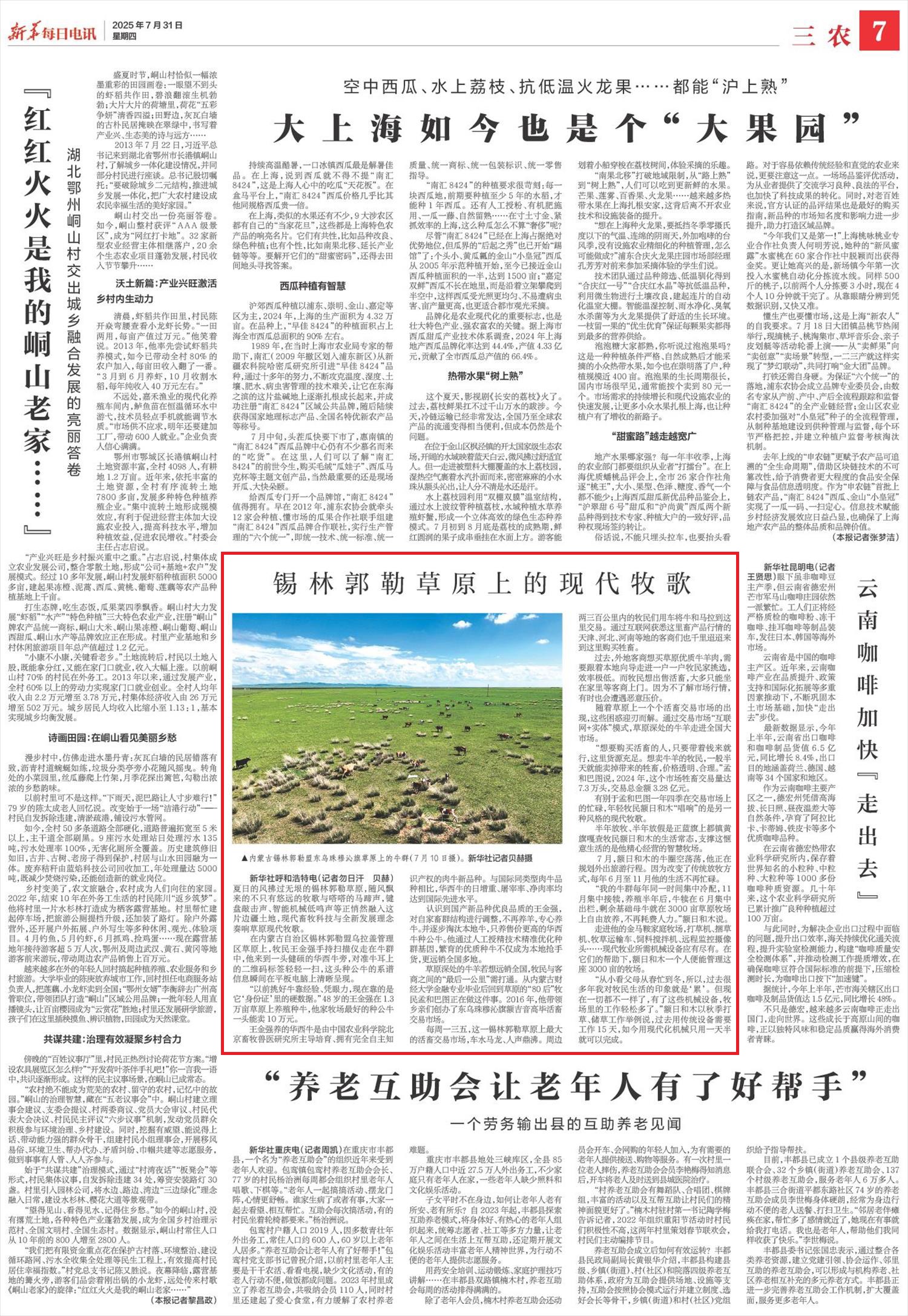 2025年7月31日,《新華每日電訊》第7版刊發(fā)題為《錫林郭勒草原上的現(xiàn)代牧歌》的文章,報道了夏日的風(fēng)拂過無垠的錫林郭勒草原,隨風(fēng)飄來的不只有悠遠(yuǎn)的牧歌與嗒嗒的馬蹄聲,鍵盤敲擊聲、智能機械低鳴聲等正悄然融入這片邊疆土地,現(xiàn)代畜牧科技與全新發(fā)展理念奏響草原現(xiàn)代牧歌。