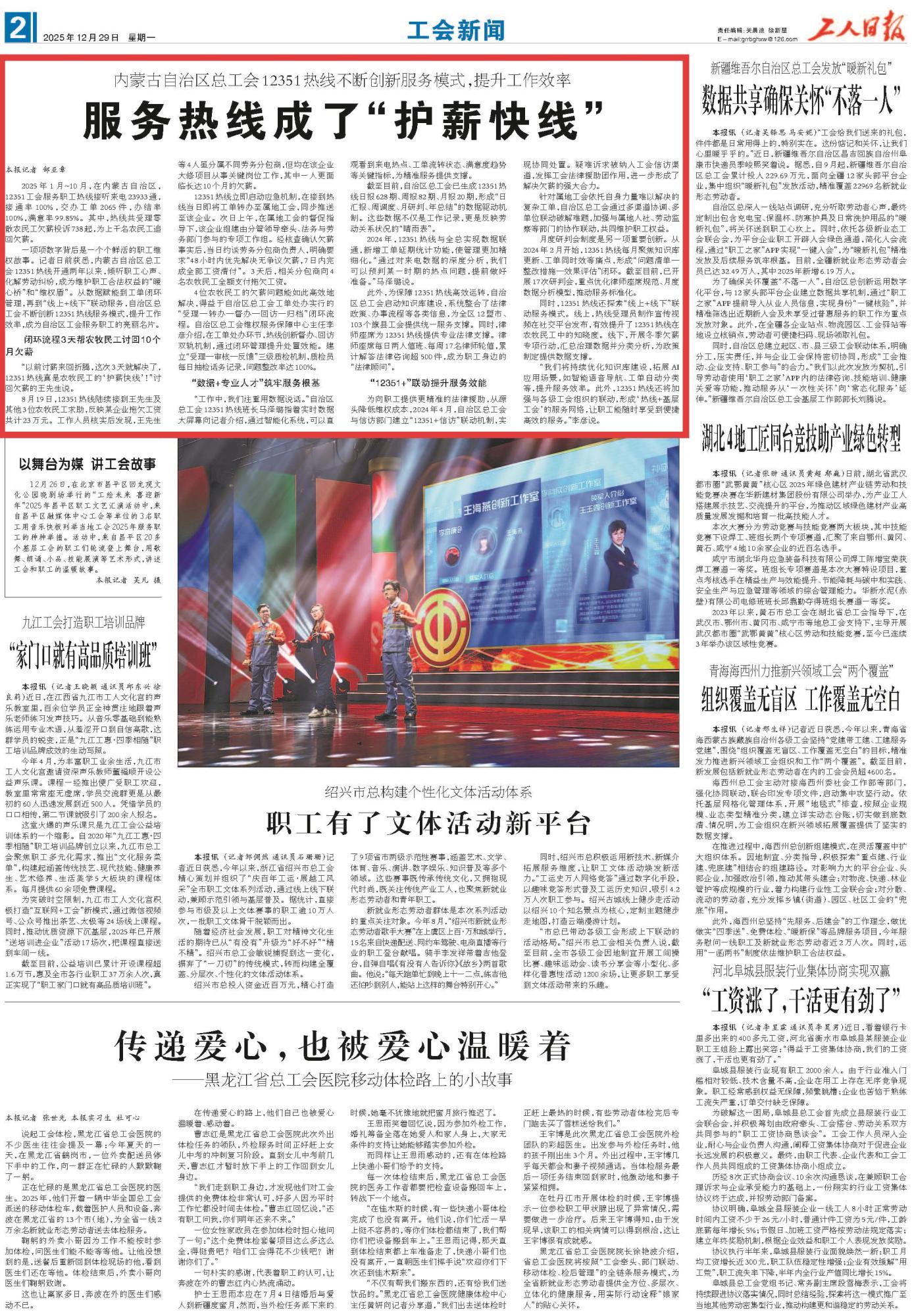 2025年12月29日,《工人日報》第2版刊發(fā)題為《服務熱線成了“護薪快線”》的文章,報道了內(nèi)蒙古自治區(qū)總工會12351熱線開通兩年以來,傾聽職工心聲、化解勞動糾紛,成為維護職工合法權益的“暖心橋”和“維權盾”。其中,熱線共受理零散農(nóng)民工欠薪投訴738起,為上千名農(nóng)民工追回欠薪。