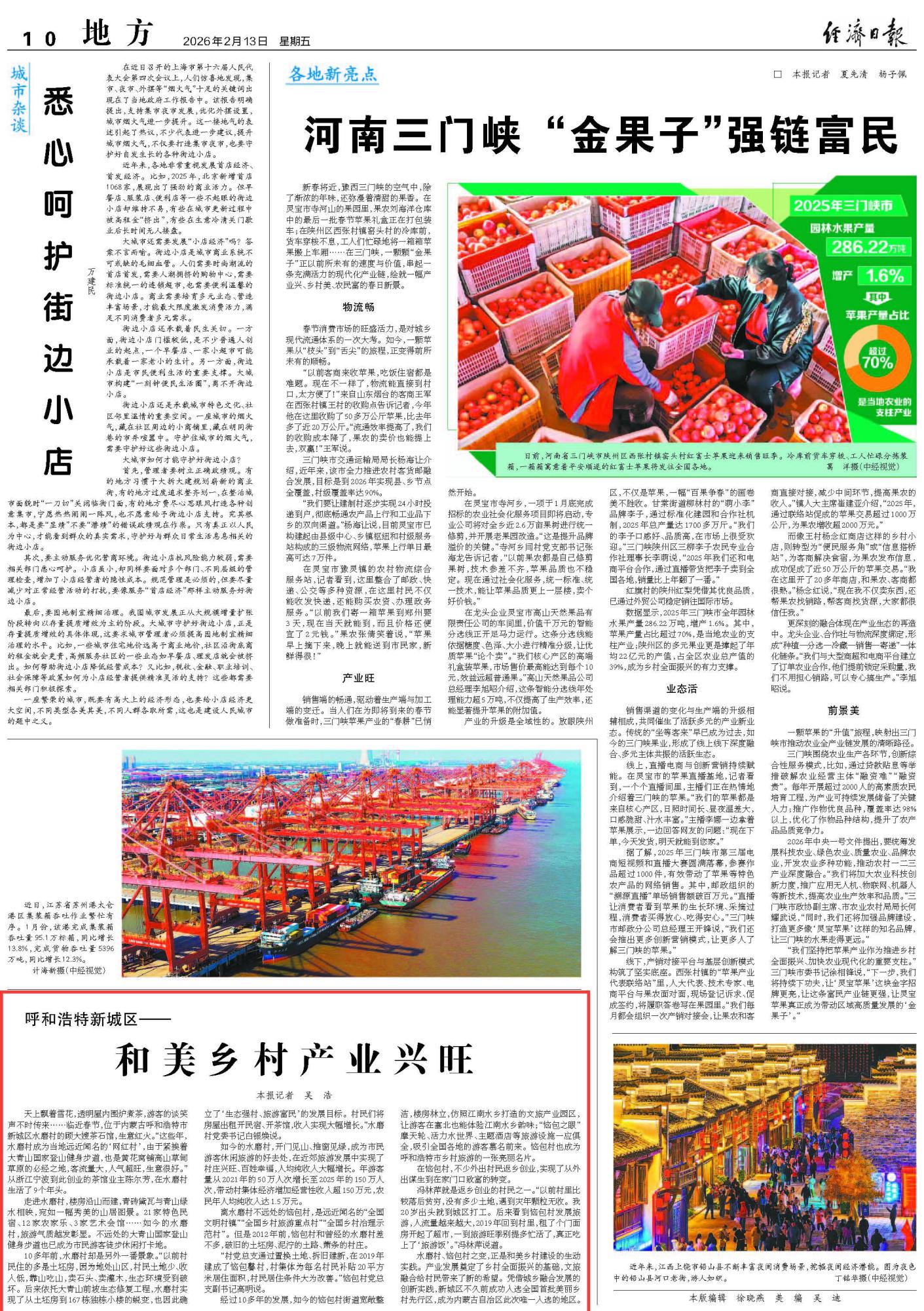 2026年2月13日《經(jīng)濟(jì)日?qǐng)?bào)》第10版刊發(fā)了《呼和浩特新城區(qū)——和美鄉(xiāng)村產(chǎn)業(yè)興旺》的文章,報(bào)道了內(nèi)蒙古呼和浩特市新城區(qū)水磨村、惱包村之變,是和美鄉(xiāng)村建設(shè)的生動(dòng)實(shí)踐。新城區(qū)成功入選全國(guó)首批美麗鄉(xiāng)村先行區(qū),成為內(nèi)蒙古自治區(qū)此次唯一入選的地區(qū)。產(chǎn)業(yè)發(fā)展奠定了鄉(xiāng)村全面振興的基礎(chǔ),文旅融合給村民帶來(lái)了新的希望。