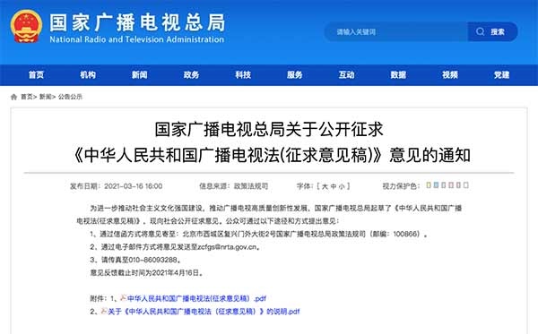 3月16日,國家廣播電視總局發(fā)布《中華人民共和國廣播電視法(征求意見稿)》(以下簡(jiǎn)稱“征求意見稿”),向社會(huì)公開征求意見。征求意見稿分為總則、業(yè)務(wù)準(zhǔn)入、制作播放、傳輸覆蓋、公共服務(wù)、扶持促進(jìn)、安全保障、監(jiān)督管理、法律責(zé)任和附則,共10章80條。意見反饋截止日期為2021年4月16日。