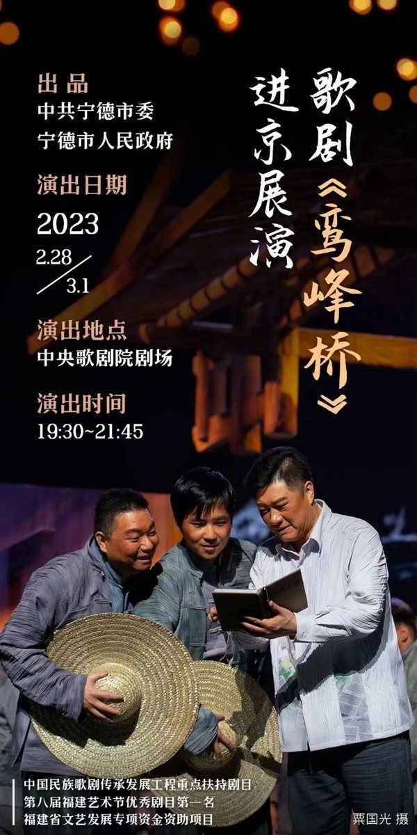 人民網福州2月27日電 (劉卿)日前,文化和旅游部公布“新時代舞臺藝術優(yōu)秀劇目展演”進京集中示范演出劇目,由中共寧德市委、寧德市人民政府出品的歌劇《鸞峰橋》入選。據了解,該劇將于2月28日至3月1日每晚19:30至21:45在中央歌劇院劇場進行展演。