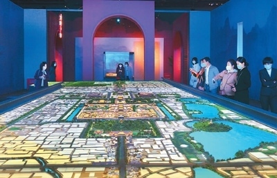 走進“壯美中軸”展區(qū),一個16米長的沙盤將北京中軸線沿線建筑全貌清晰呈現在眼前,帶給人強烈的視覺震撼。北起鐘鼓樓,南至永定門,北京中軸線全長約7.8公里,是世界上現存最長的城市中軸線。沙盤上的立體投影模擬出晝夜交替、四季輪轉的景象,讓人仿佛穿越時空,感受中軸線的歷史演變。沙盤兩側的電子屏滾動播放著三維動畫,立體展現故宮、天壇、景山等中軸線重要遺產點。