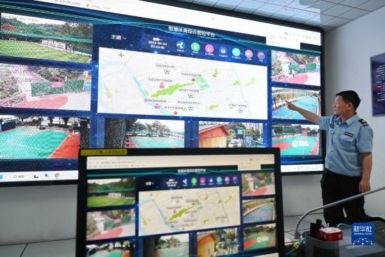 4月24日,西河智慧體育公園工作人員在介紹智慧體育綜合管控平臺(tái)。該平臺(tái)可對公園內(nèi)的人流、安全、環(huán)境以及公園周邊“15分鐘健身圈”運(yùn)動(dòng)場地的門禁、燈光等設(shè)備實(shí)現(xiàn)智能化管理。