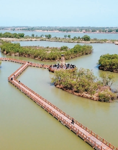 在山東黃河三角洲國家級自然保護區(qū)里,游客正在參觀。本報記者 劉發(fā)為攝