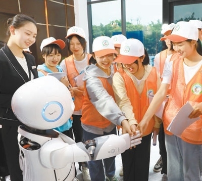 “數游峨眉”體驗中心,參加研學的學生與智能講解機器人互動。 峨眉山市融媒體中心供圖
