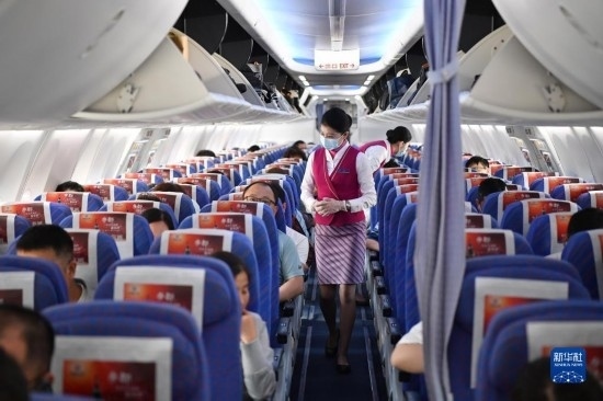 5月13日,在西安-烏魯木齊-阿什哈巴德首趟航班上,乘務員在起飛前進行客艙安全檢查。新華社記者 邵瑞 攝