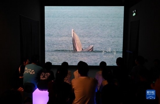 8月26日,游客在國家海洋博物館“鯨奇物語”展區(qū)觀看鯨魚相關科普視頻。