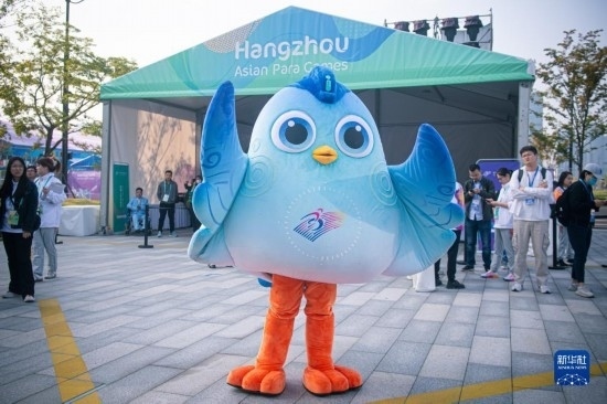 10月16日,杭州亞殘運(yùn)會(huì)吉祥物“飛飛”在開村儀式上。新華社記者 江漢 攝
