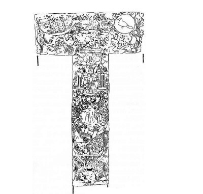 需要指出的是,這一進(jìn)程和墓主人辛追靈魂升仙的進(jìn)程是同步的。馬王堆漢墓T形帛畫(huà)的構(gòu)圖和漢代畫(huà)像石天界、人間、地下世界的三段模式非常近似,所以很多學(xué)者據(jù)此將T形帛畫(huà)也劃分為天界、人間、地下三部分。但這種看法我不贊成。我比較贊同T形帛畫(huà)的主題是引魂升天的主張。日本京都大學(xué)教授曾部川寬對(duì)漢代靈魂升仙的主題有非常深入的研究。1981年他出版的《向昆侖山升仙——古代中國(guó)人描繪的死后世界》(《崑崙山への昇仙——古代中國(guó)人が描いた死後の世界》)中,指出這幅非衣的主題就是升仙主題。整幅T形帛畫(huà)描述的是墓主人辛追升仙的進(jìn)程。從下到上,T形帛畫(huà)中央整個(gè)中軸貫穿著的是一個(gè)升騰的主題。陰陽(yáng)兩條龍自下而上在中央部分穿璧而過(guò),托舉起魂車(chē)。魂車(chē)上的核心人物通常認(rèn)為就是墓主人辛追。按照這一解釋?zhuān)虚g部分描繪的并不是我們生活的人間,而是從地下向天界升騰的墓主人辛追不斷升向仙界的魂魄。畫(huà)面上她的魂魄正被二龍牽引的魂車(chē)引向天門(mén)。從時(shí)間上說(shuō),辛追的魂魄將要進(jìn)入的,同樣是由死亡而再生的進(jìn)程。