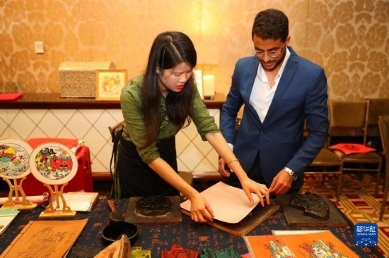 11月19日,在埃及開羅舉行的粵港澳大灣區(qū)世界級旅游目的地推介暨“魅力廣東”視覺展上,一名男子在非遺展區(qū)體驗?zāi)景迥戤嬛谱鳌?/p>
