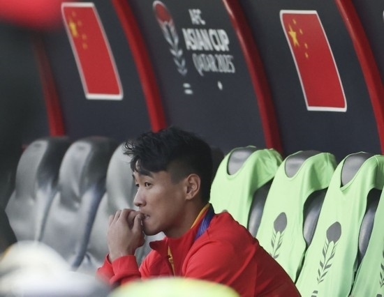 1月13日,中國隊(duì)對陣塔吉克斯坦隊(duì),圖為因傷未能進(jìn)入名單的韋世豪賽前在替補(bǔ)席上。新華社記者 曹燦 攝
