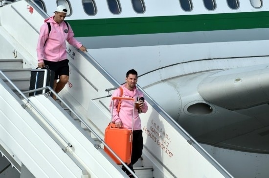 2月2日,梅西與其效力的邁阿密國際隊抵達香港國際機場,圖為梅西(右)與蘇亞雷斯走下舷梯。新華社記者 盧炳輝 攝