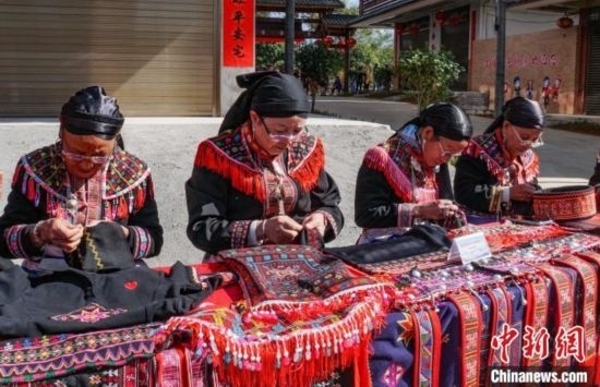 盤王節(jié)上,瑤族婦女現(xiàn)場展示反面繡技藝。 蔣豐慧 攝