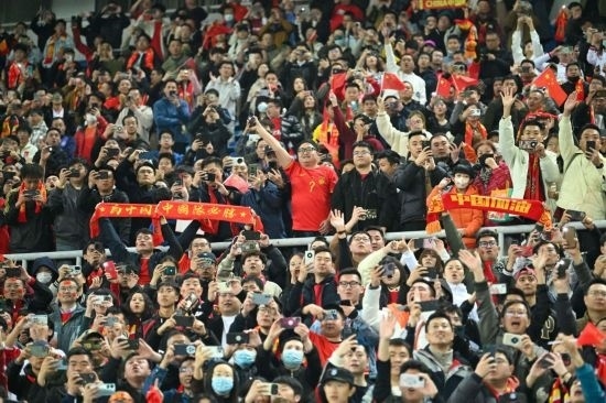 據(jù)主辦方介紹,天津奧體中心體育場的球票基本銷售一空,有42977名觀眾到場為中國隊助威。比賽在晚上8點開球,結束已是10點左右。初春夜晚加之冷風,寒意十足,但球迷的熱情和助威貫穿全程。