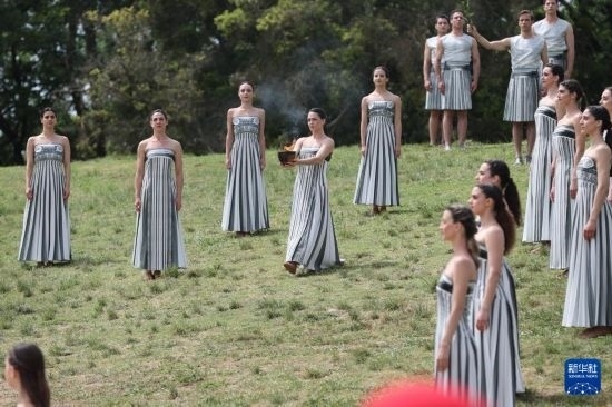 4月16日,扮演最高女祭司的演員瑪麗·米娜取得圣火。當(dāng)日,2024年巴黎奧運(yùn)會(huì)圣火火種采集儀式在希臘伯羅奔尼撒半島的古奧林匹亞遺址舉行。新華社記者李京攝