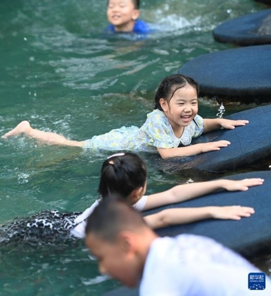 7月5日,小朋友在杭州宋城景區(qū)戲水。