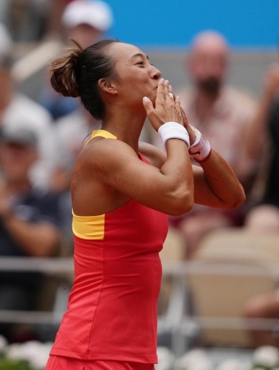 8月3日,鄭欽文在奪冠后向觀眾致意。 當(dāng)日,在巴黎奧運(yùn)會(huì)網(wǎng)球女子單打金牌賽中,中國(guó)選手鄭欽文2比0戰(zhàn)勝克羅地亞選手維基奇,奪得金牌。 新華社記者 萬(wàn)象 攝