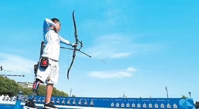 當?shù)貢r間8月24日,在法國巴黎榮軍院旁的射箭訓(xùn)練場內(nèi),中國殘奧射箭隊在進行適應(yīng)性訓(xùn)練。拉弓、瞄準、松弦,中國隊選手甘俊射出正中靶心的一箭后,臉上露出笑容。他表示:“風速、風向?qū)穆潼c影響較大,我會盡快適應(yīng),調(diào)整到最佳狀態(tài)?!备士ψ约簠⒓拥氖讓脷垔W會充滿期待。