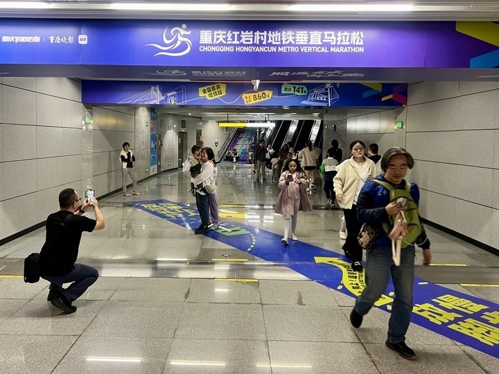 國(guó)慶前夕,這里剛舉辦了一場(chǎng)垂直馬拉松。賽事帶來(lái)品牌效應(yīng),前來(lái)打卡的人群絡(luò)繹不絕?!按怪瘪R拉松一般在摩天大樓里舉辦,如今地鐵站里居然能跑馬拉松,重慶總是能給游客帶來(lái)驚喜?!眮?lái)自河北的游客張楠說(shuō)。